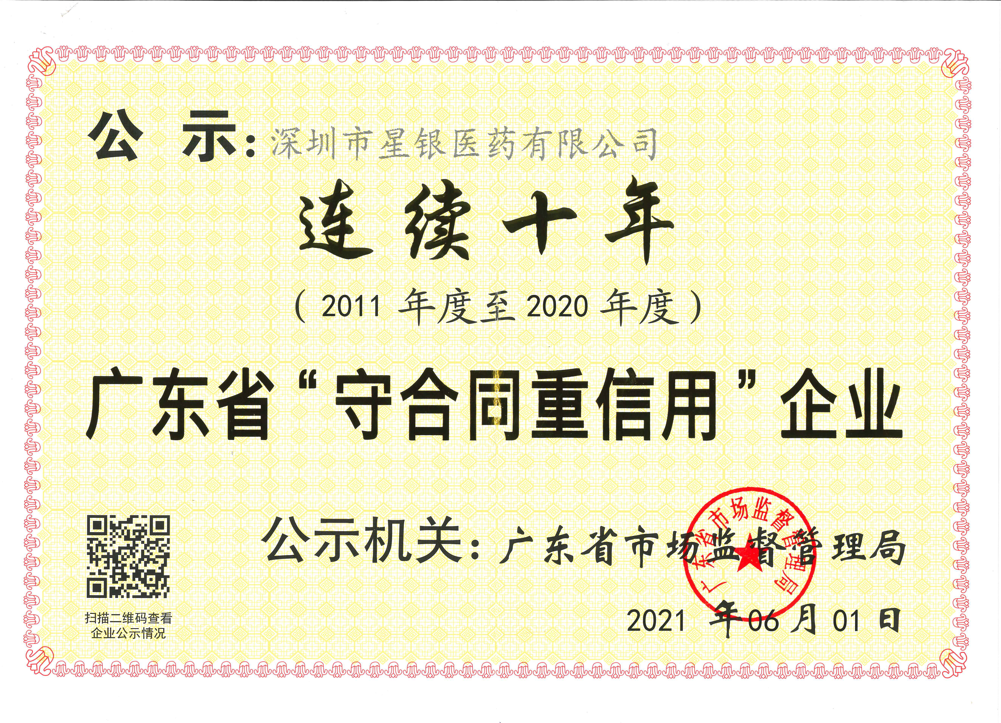 星銀醫(yī)藥連續(xù)十年蟬聯(lián)“廣東省守合同重信用企業(yè)”稱號