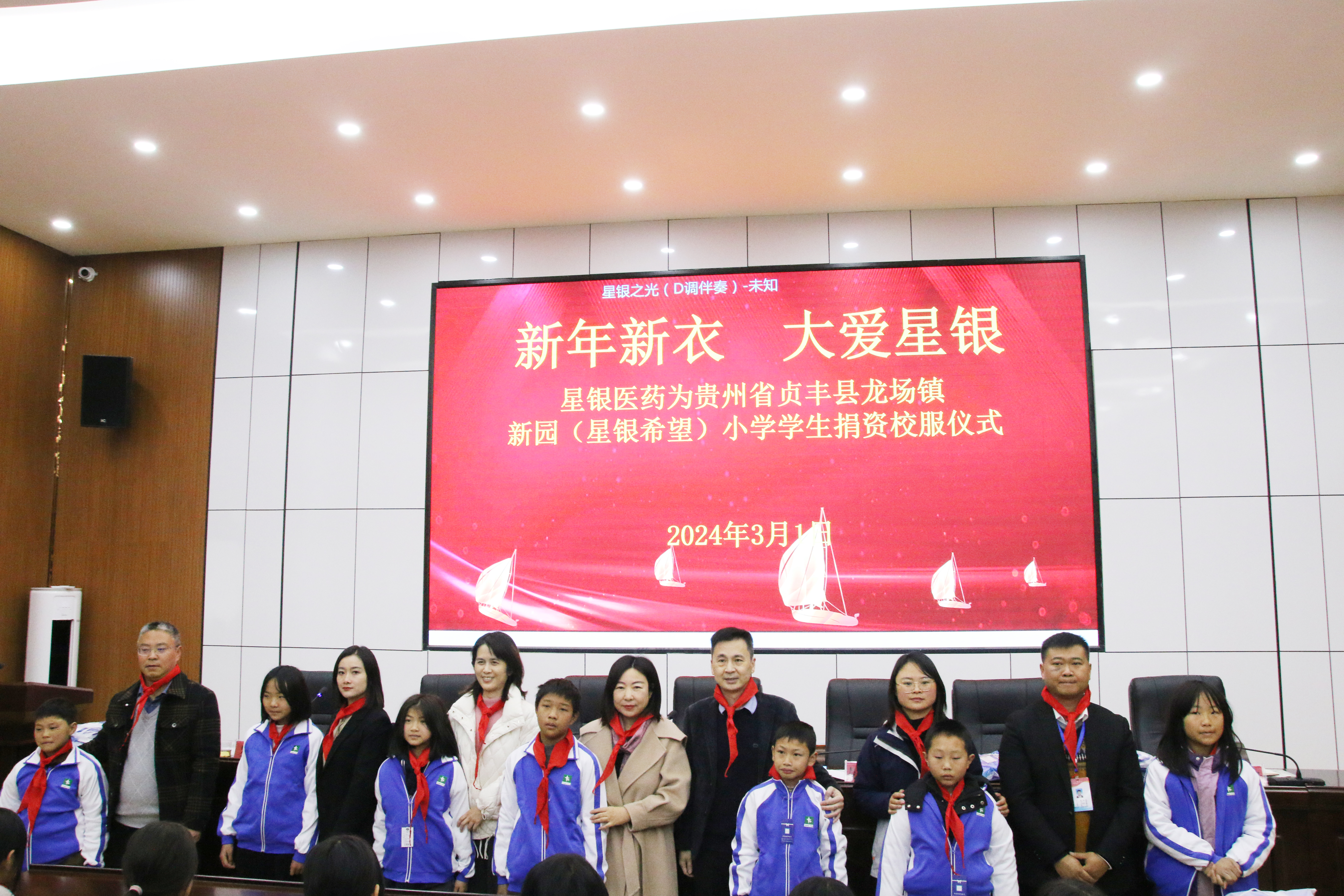 24/06-05春山日暖,萬物萌新。3月1日,新學期開學季,深圳市星銀醫(yī)藥有限公司在貴州省貞豐縣龍場鎮(zhèn)新園(星銀希望)小學舉辦“新年新衣 大愛星銀”校服捐贈儀式。公司領導、星銀醫(yī)藥工會、星銀醫(yī)藥黨支部及貴州辦事處相關人員參加此次愛心捐贈活動,貴州省貞豐縣龍興街道辦領導、新園小學全校師生及媒體記者共同見證這溫暖時刻。